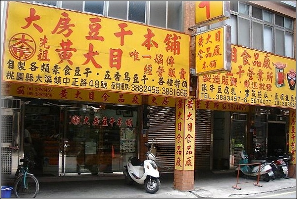 小K當初為了搞懂大溪豆干的脈絡典故,特別花了頗長的時間到網路上搜尋,最終他才知道,原來據說大溪黑豆干的創始人黃屋(黃大目)一開始在大溪街上販賣豆干都以「黃日香」為名,後來黃大目的三個兒子分家,老大與老三分別跟隨黃大目習得製作豆干的方法,而後,老三同時申請「黃日香」、「黃大目」的註冊商標,後來因故將「黃大目」的商標轉售給外人。