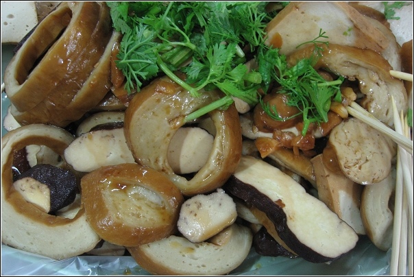 「黑豆干是以焦糖為基本原料,所製出來的豆干即成深褐色。因為焦糖具有防腐功效,所以早期沒有冷藏設施時,用焦糖滷豆干是最佳的保存方法。當日未賣完的豆干經過一滷再滷,顏色也就由深褐色變為黑褐色。」小K說