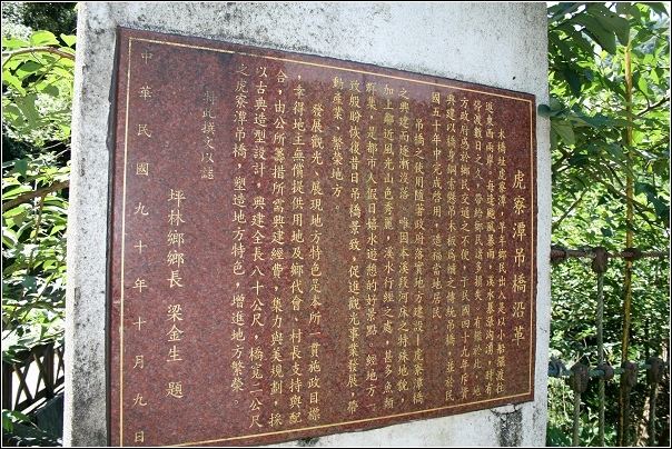 導覽告訴我,虎寮潭以前稱「虎尾寮」,因為早期此地的北勢溪沿岸搭建許多工寮,一撮撮看來像是老虎的尾巴,因此稱為「虎尾寮」,後來簡稱虎寮,加上北勢溪在此形成曲流地形,狀似一泓潭水,先人便將此地稱為「虎寮潭」。