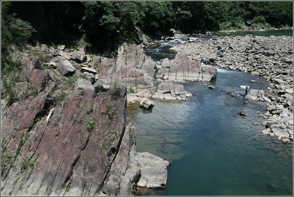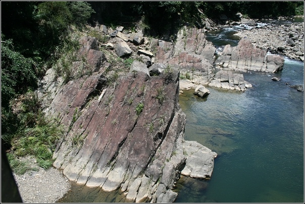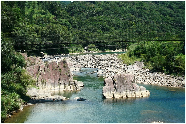 虎寮潭吊橋下,溪谷巨石經過長期河水沖刷,形成不規則狀,宛如狗齒般,造就虎寮潭溪谷著名的「狗齒地形」,也增添虎寮潭更具迷人風采的天然景觀!