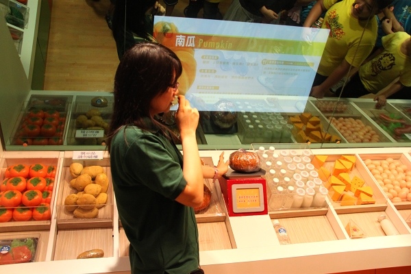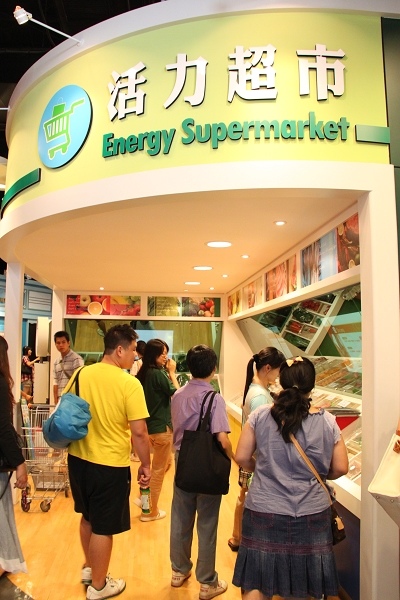 展區中的活力超市站,模擬真實超市購物環境,生鮮架上的展示食物都能移動放置到磅秤,顯示食物的主要營養素和主要效用,瞭解如何吃出健康。