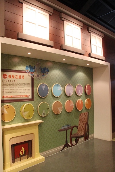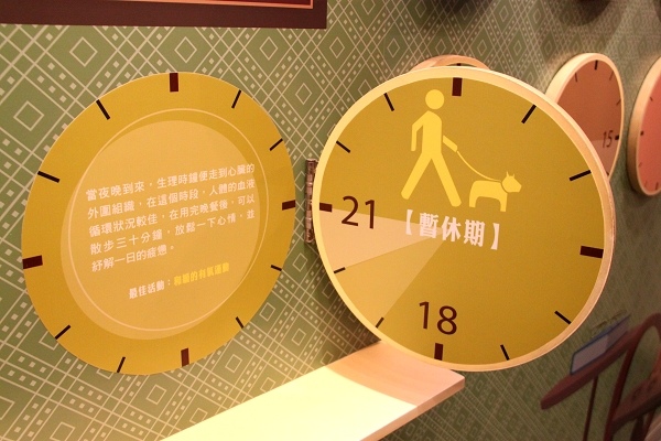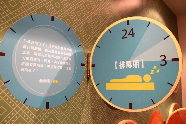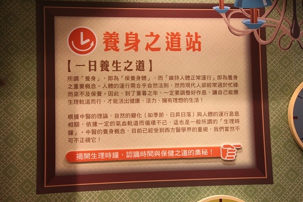 養身之道站,透過牌示,揭開生理時鐘和保健之道的奧秘,隱藏式時鐘內,有一天當中各時期養生注意事項,相當值得參考。