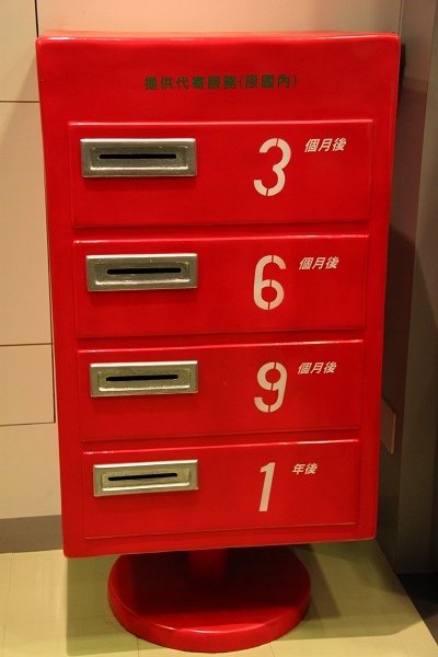 特別有趣的是下圖這個「時空郵局」,可以提供國內代寄服務,而收件日期卻都訂在3、6、9個月及1年以後,您可以在全方為保健站選購自己喜歡的明信片,書寫後投了郵筒的指定時間,館方人員就會依您指定的時間幫您寄出。