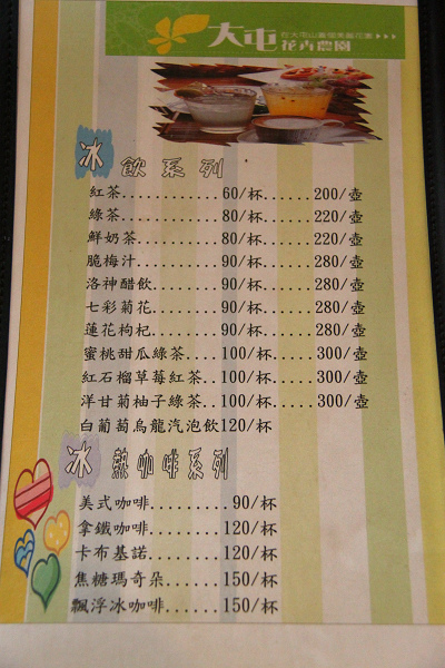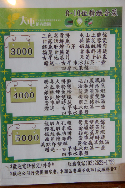 園區提供中、晚餐與下午茶,備有許多座位。這裡的清炒蔬菜大都是剛到菜園裡採摘的,美味的鱒魚也多半是園區自行養殖,加上山上飼養的放山土雞、道地農村菜餚,美味又好吃,經常吸引不少遊客來此訂席。非常適合平日家常聚餐小酌或田園宴席、團體活動辦席等。