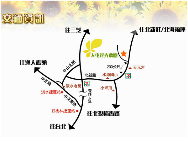 1.自行開車:往三芝北新莊方向,至北新路三段經過7-11便利商店,往前走150公尺左轉進入約400公尺可抵。