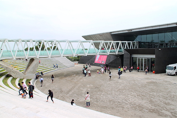 來到「苗栗客家文化園區」當然要仔細瞧瞧園區建築與館內的各項展覽囉!首先看看園區內的主體建築,入口空橋連結兩端,橋下鑿成的空地與抽象的梯田造型,可作為表演場與看台,循著空橋往主建築二樓走,可以通往各個場館。走在空橋上,感覺濃烈的現代感,即將前進去回顧客家文化與歷史。