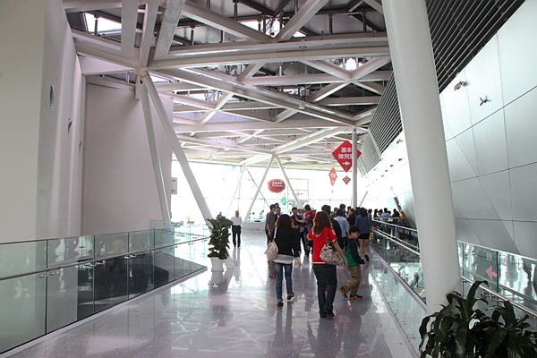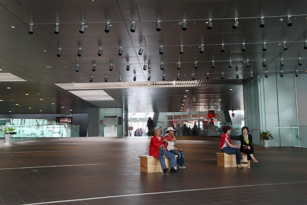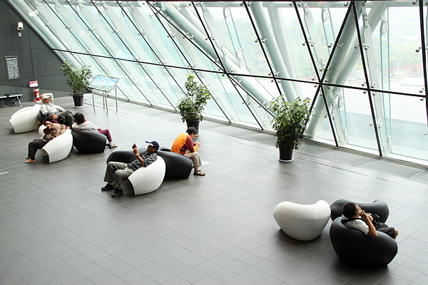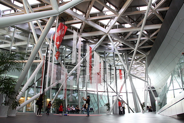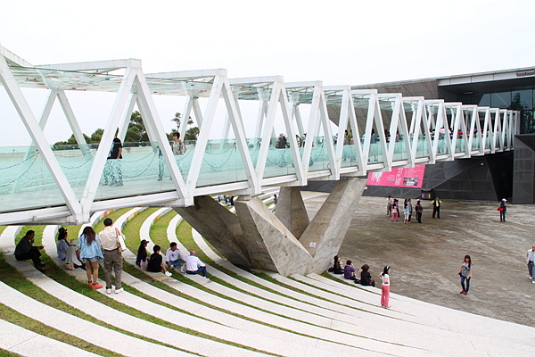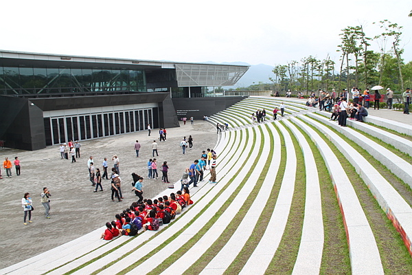 展館一樓中庭交流斜坡廣場,新穎的現代化設計,展現這棟綠色建築的宏觀,這裡也提供遊客休憩好地方,許多遊客逛累了,會在這裡選張造型沙發椅或是木椅小憩,從這裡的玻璃帷幕可見帷幕外山腳下的美麗風光。