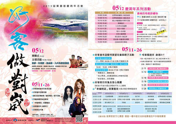 去年(民國101年)5月12日開始營運,「苗栗客家文化園區」堂堂邁入一週年,從3月30日開始一直到6月29日,在園區展館一樓中庭交流斜坡廣場,每週六都有「客聲閃耀」節目活動,和遊客一起慶祝這裡一週年生日。