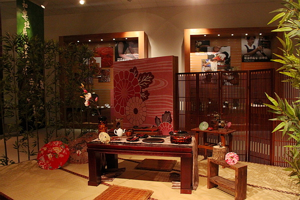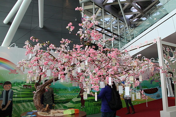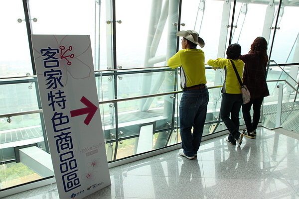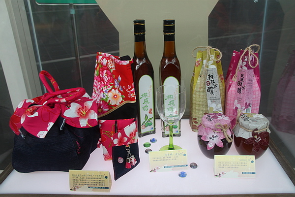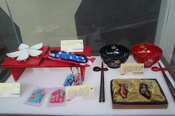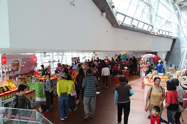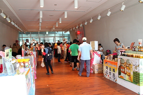 一樓中庭交流斜坡廣場有時也會設置苗栗相關特產、工藝品展示,讓人有機會多多認識苗栗當地的優良、精美產品。