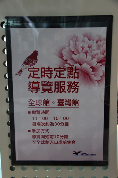全球館和台灣館都有定時定點導覽服務,上、下午各一場,每場次30分鐘,參加方式,只要在導覽開始前10分鐘,至全球館入口處前集合即可。
