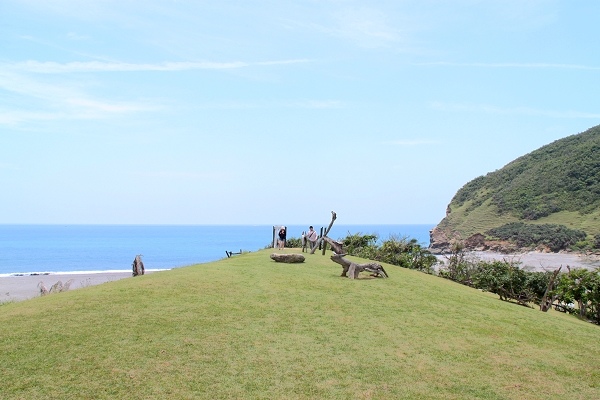 進入園區後,可以看到左側低窪處有一處大草坪,和草坪毗鄰的是一大片未受污染的海灘,牛山呼庭的主人將這片海灘取為「換膚海灘」,此處沿岸潮流與注入的河川經常上演者拉鉅卡位戰,海灘依序呈現礫卵石、細沙,以及被海浪沖刷上岸的漂流木等,也讓這片海灘呈現四時不同的風情,因此被主人取為「換膚海灘」,真是創意十足。因地理位置與交通不便,海灘未受太多污染與人為破壞,即使是假日,也無七星潭海灘那般人滿為患,隱約中多了一份寧靜之美,令人流連。