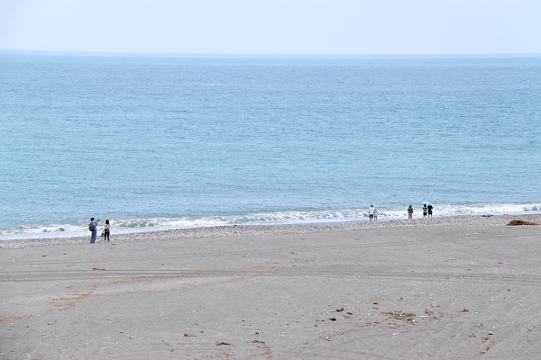 斜坡上望向太平洋,視野相當遼闊,海灘上點綴幾個遊客,畫面沒那麼擁擠,也多了些美感。