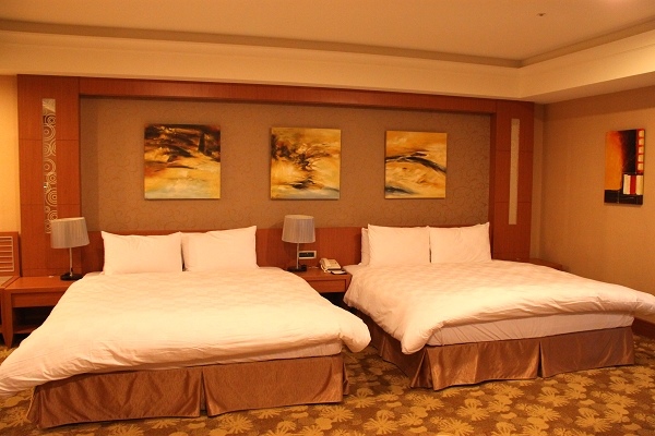 華園飯店主要房型包括:都會風尚房、時尚品味房、典雅房、溫馨家庭房、家庭設計房、總統套房等。我住的時尚商務館房間依照顏色來布置,三樓屬於熱情紅、四樓風尚銀、五樓自由藍、六樓和平綠、七樓復古黑,都屬兩人房,可分兩張單人床與一張雙人床,房間雖不大,但是麻雀雖小、五臟俱全,應有的設備幾乎都涵蓋。